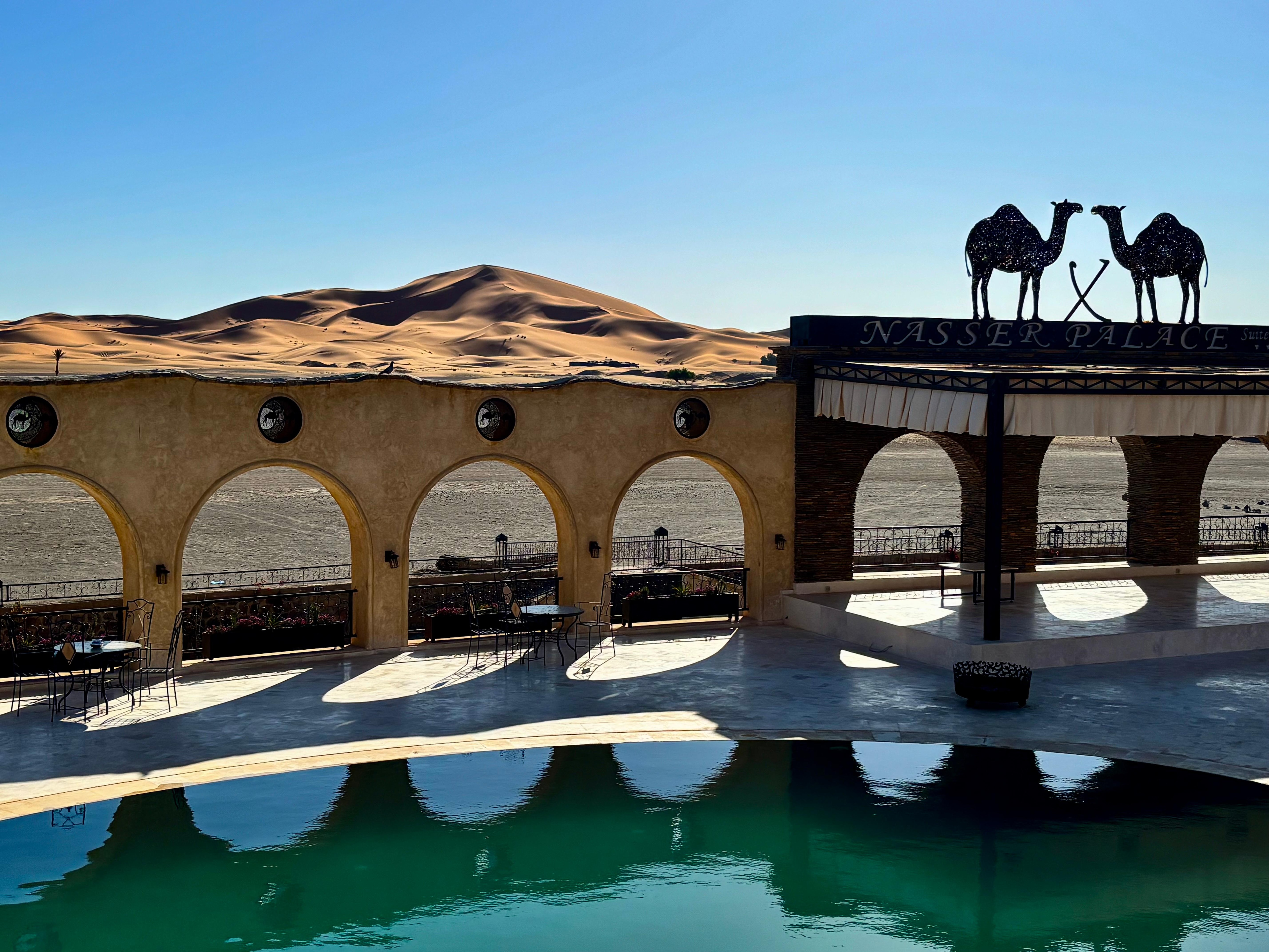 An Arabian Nights Dream at the Edge of the Dunes If you are traveling to Merzouga, skip the generic resorts and stay at Nasser Palace. This isn't just a hotel; it’s an authentic gateway to the Sahara. Located in Hassilabied, right at the foot of the Erg Chebbi dunes, it offers an experience that feels like stepping into a movie set. The Vibe: The architecture is stunning—a traditional artisanal kasbah with beautiful carvings and a sprawling central patio. Whether you’re lounging by the emerald-green pool or sitting on the terrace watching the sunrise over the sand, the "Arabian Nights" atmosphere is everywhere. The Desert Experience: They are experts at desert logistics. We did the camel trek into the dunes for sunset, and it was seamless. They also offer 4x4 adventures and sandboarding. Being only a 1-minute walk from the dunes means you can wander out to see the stars whenever you like. The Food: The kitchen here is incredible. Breakfast was amazing, they also serve lunch and dinner. Authentic Wellness: After a dusty day in the desert, the Beldi Spa and Hammam were a godsend. They even offer traditional sand therapy (Sablothérapie) during the summer months, which is a unique local experience you won't find at many other places. Exceptional Hospitality: The staff, led by Lehsen and El Bashir the manager, go above and beyond.