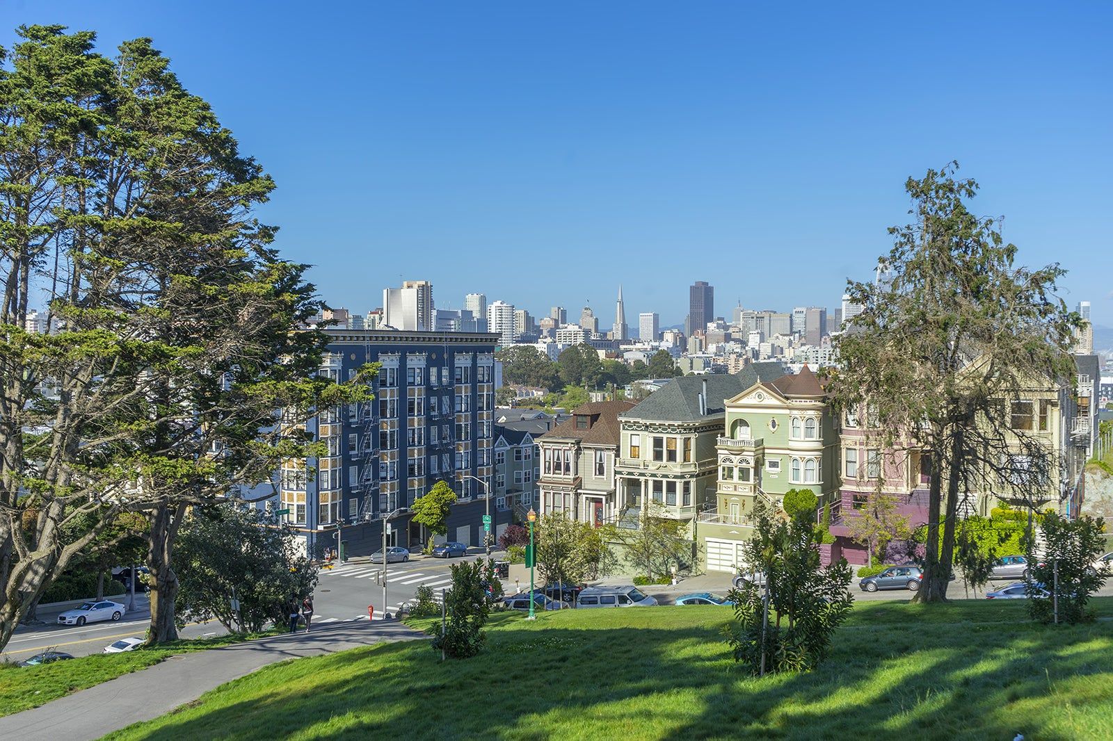 Alamo Square Park is a tranquil residential park with vibrant green, grassy fields nestled by the iconic Painted Ladies set of houses. Within this park, you’ll find several walking paths along with towering trees that can offer some much-needed shade on those sunny days.