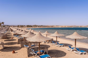 Das Hotel liegt direkt an der Bucht von Abu Dabbab, in der viele Meeresschildkröten und andere Tiere leben. Das Korallenriff beginnt direkt vom Hotel-Strand und ist perfekt zum Schnorcheln und Tauchen. Allgemein ist der Strand sehr schön. Leider sind die Sonnenliegen samt Windschutz aber so ausgerichtet, dass man das Wasser nicht sehen kann. Man kann eine kleine rote Flagge bekommen, damit man nicht von den vielen Verkäufern angesprochen wird.